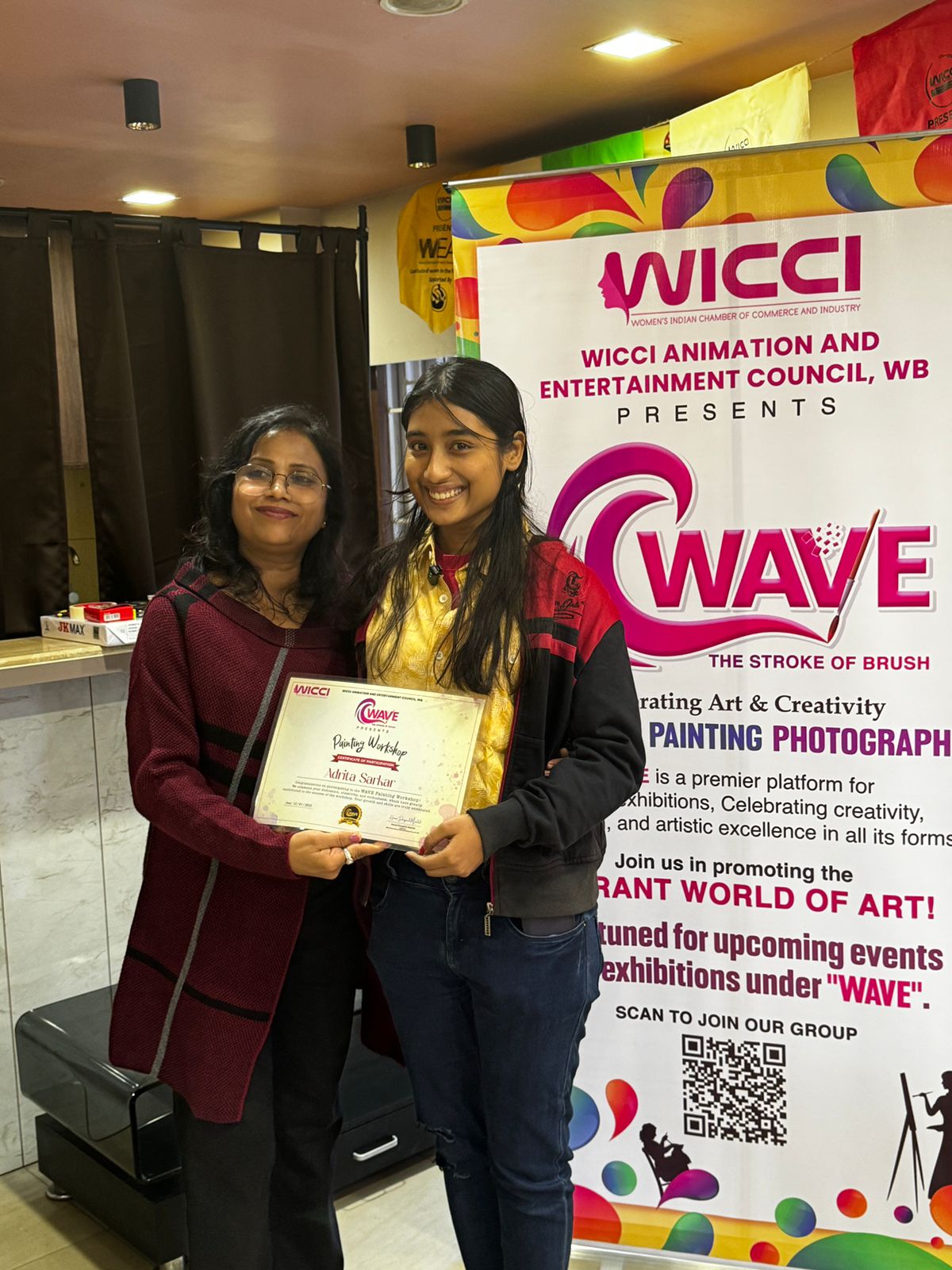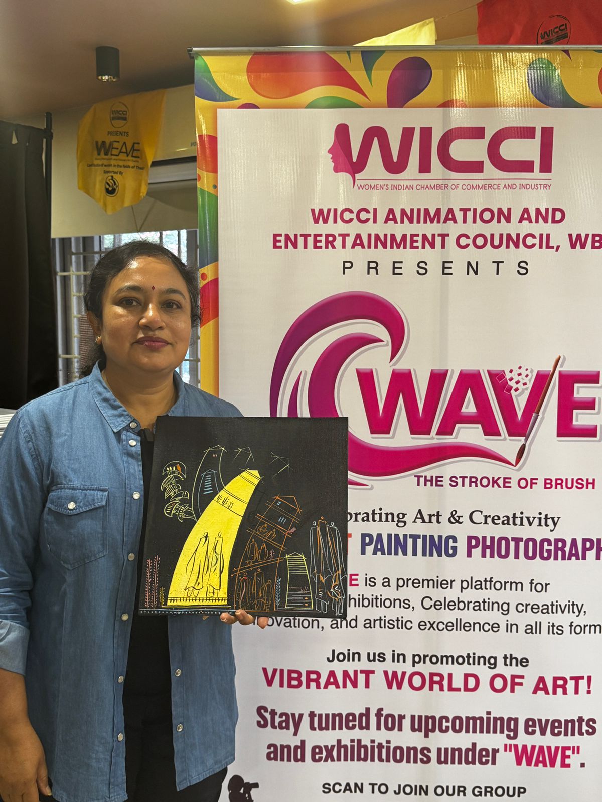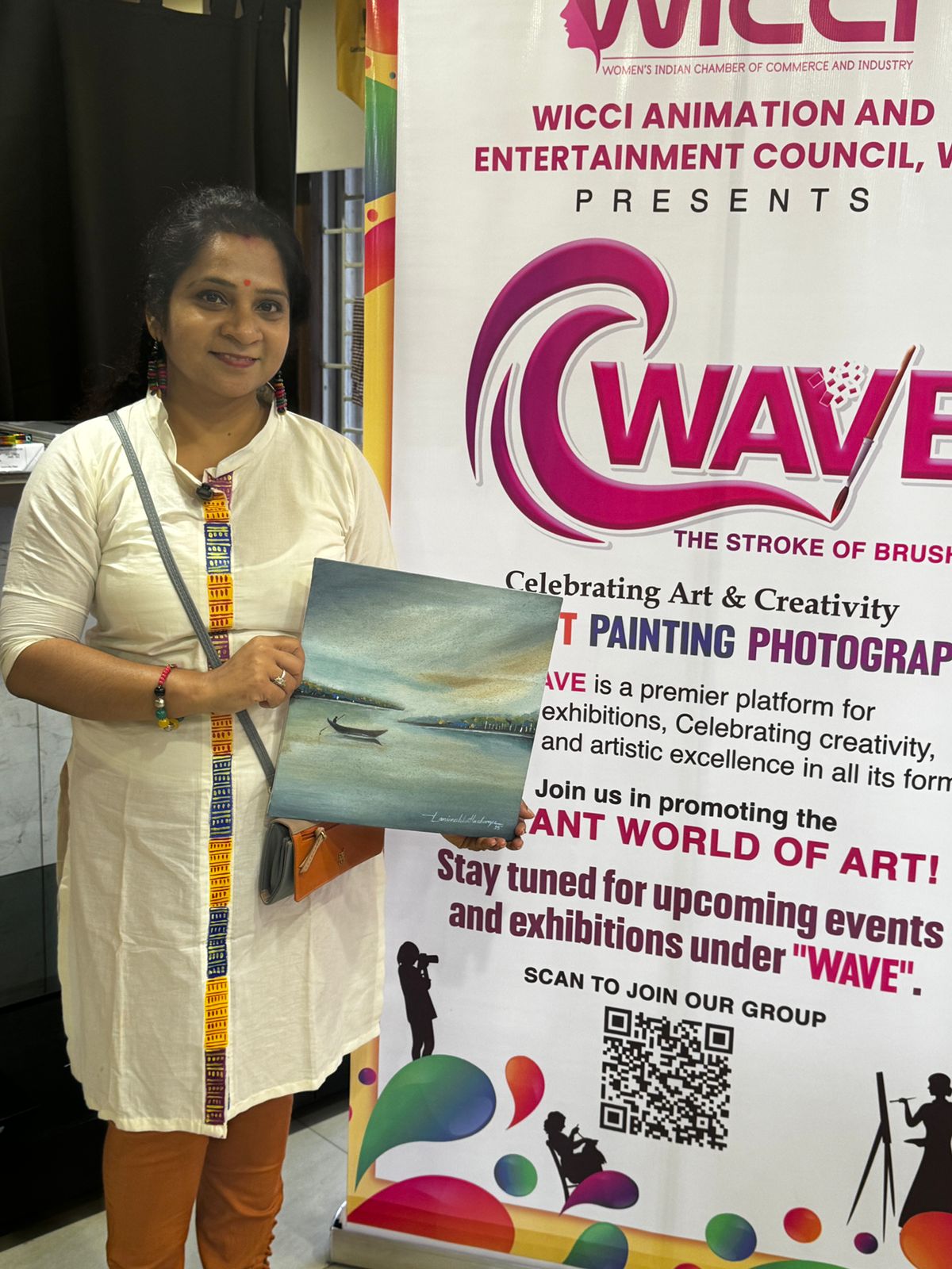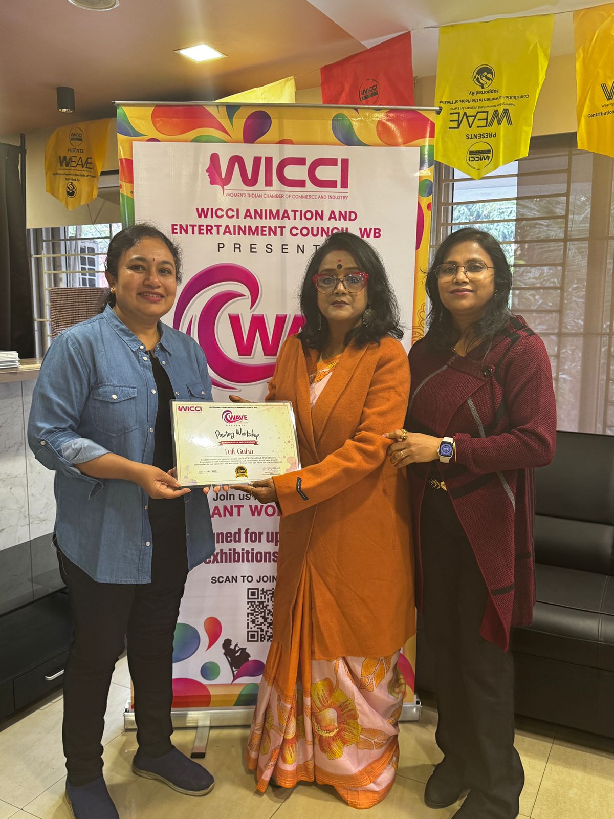 Painting Workshop: 𝐖𝐈𝐂𝐂𝐈 𝐡𝐨𝐬𝐭𝐞𝐝 𝐭𝐡𝐞 "𝐖𝐚𝐯𝐞" Painting Workshop with the support of our Animation and Entertainment Council, WICCI West Bengal president Mrs. Hansa Dangaich Mondal and our Council member and an esteemed Indian visual artist Tuli Guha.